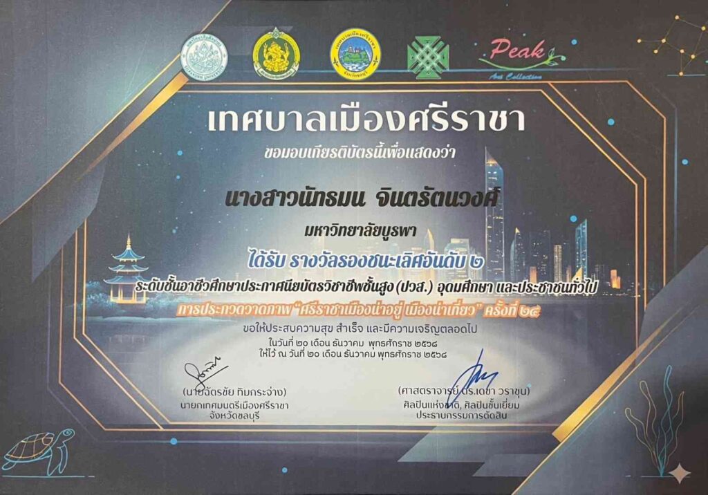 การประกวดจัดขึ้นใน วันเสาร์ที่ 20 ธันวาคม 2568 ตั้งแต่เวลา 7.00-16.00 น. ณ สวนสาธารณะอำเภอศรีราชา โดยมีนิสิต สาขาวิชาจิตรกรรมสร้างสรรค์ จำนวน 2 คน ที่ได้รับรางวัลจากการประกวดในครั้งนี้ ได้แก่