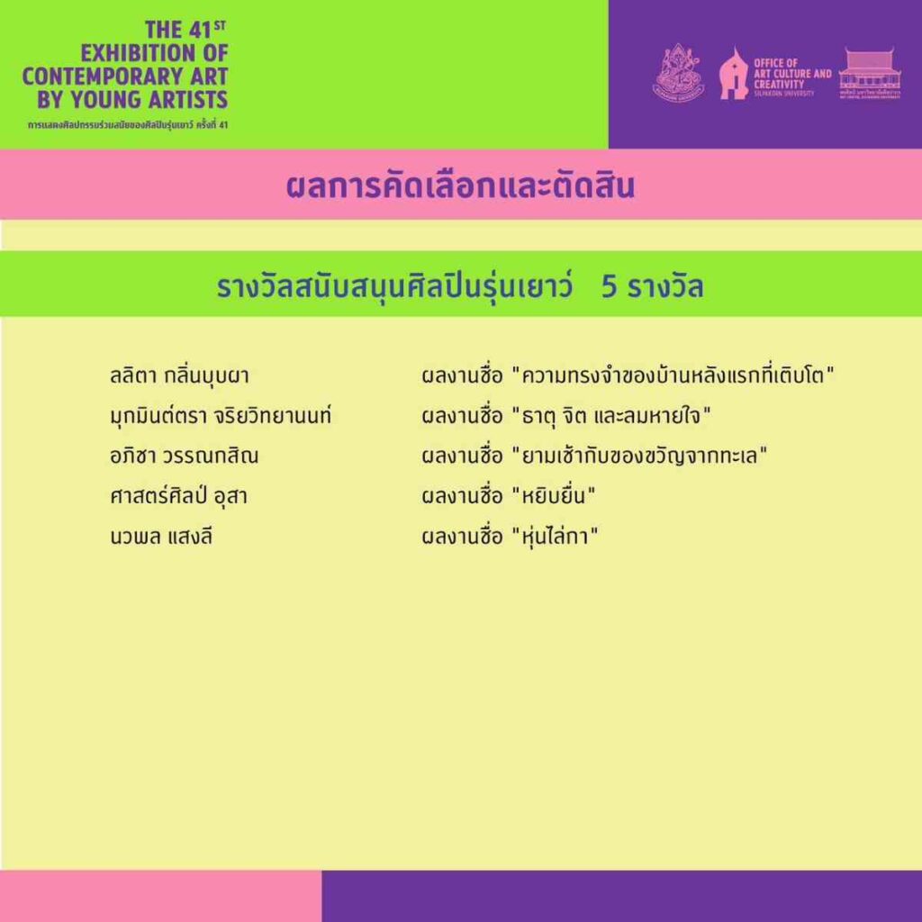 นิสิตสาขาวิชาการออกแบบเซรามิกส์ ได้รับการคัดเลือกและตัดสินให้ได้รับ “รางวัลสนับสนุนศิลปินรุ่นเยาว์” จากการแสดงศิลปกรรมร่วมสมัยของศิลปินรุ่นเยาว์ ครั้งที่ 41