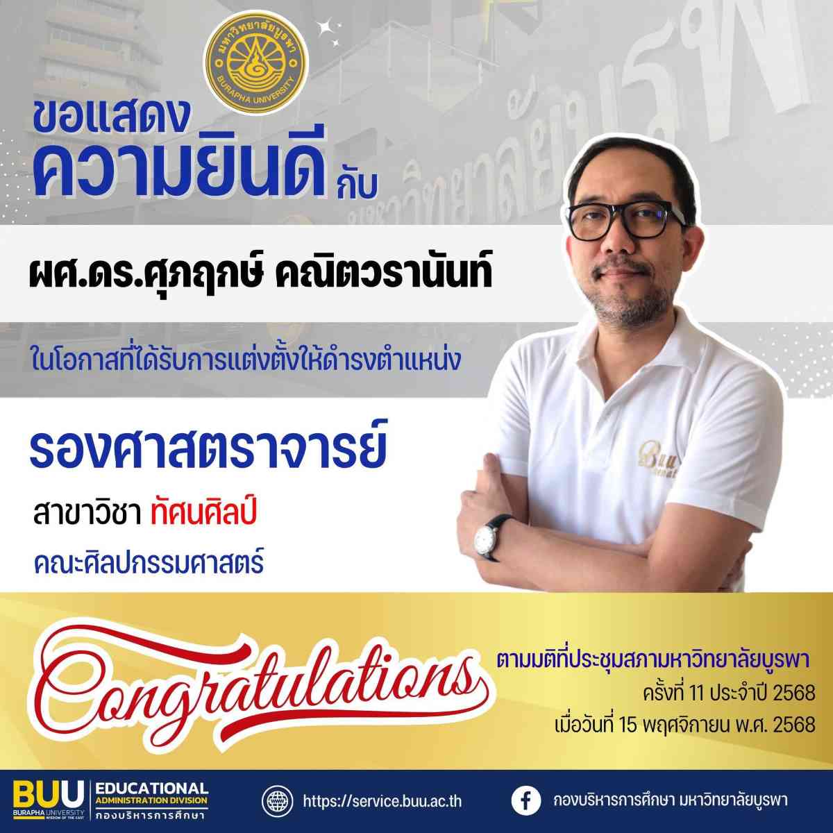 คณะศิลปกรรมศาตร์ ขอแสดงความยินดีกับ ผู้ช่วยศาสตราจารย์ ดร.ศุภฤกษ์ คณิตวรานันท์ ในโอกาสที่ได้รับการแต่งตั้งให้ดำรงตำแหน่ง รองศาสตราจารย์ สาขาวิชาทัศนศิลป์ ตามมติที่ประชุมสภามหาวิทยาลัยบูรพา ครั้งที่ 11/2568 เมื่อวันที่ 15 พฤศจิกายน พ.ศ. 2568