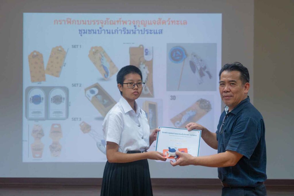 ทั้งนี้ขอขอบคุณมายัง คุณสุภาพร ยอดบริบูรณ์ ประธานวิสาหกิจชุมชนบ้านเก่าริมน้ำประแส ผู้ส่งมอบเงินรางวัลมูลค่ากว่า 20,000 บาท พร้อมของที่ระลึกให้กับนิสิตผู้ชนะการประกวด ทั้งสิ้น 11 รางวัล เป็นขวัญและกำลังใจให้กับการทำงานบริการวิชาการเพื่อชุมชน และสามารถนำไปใช้ได้จริงในเชิงพาณิชย์ต่อไป