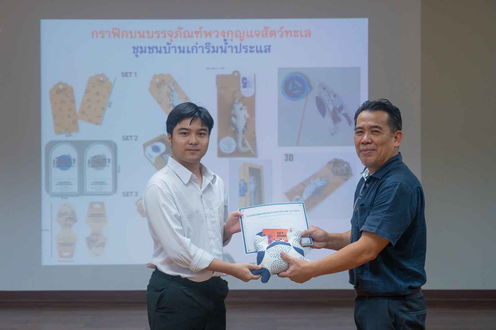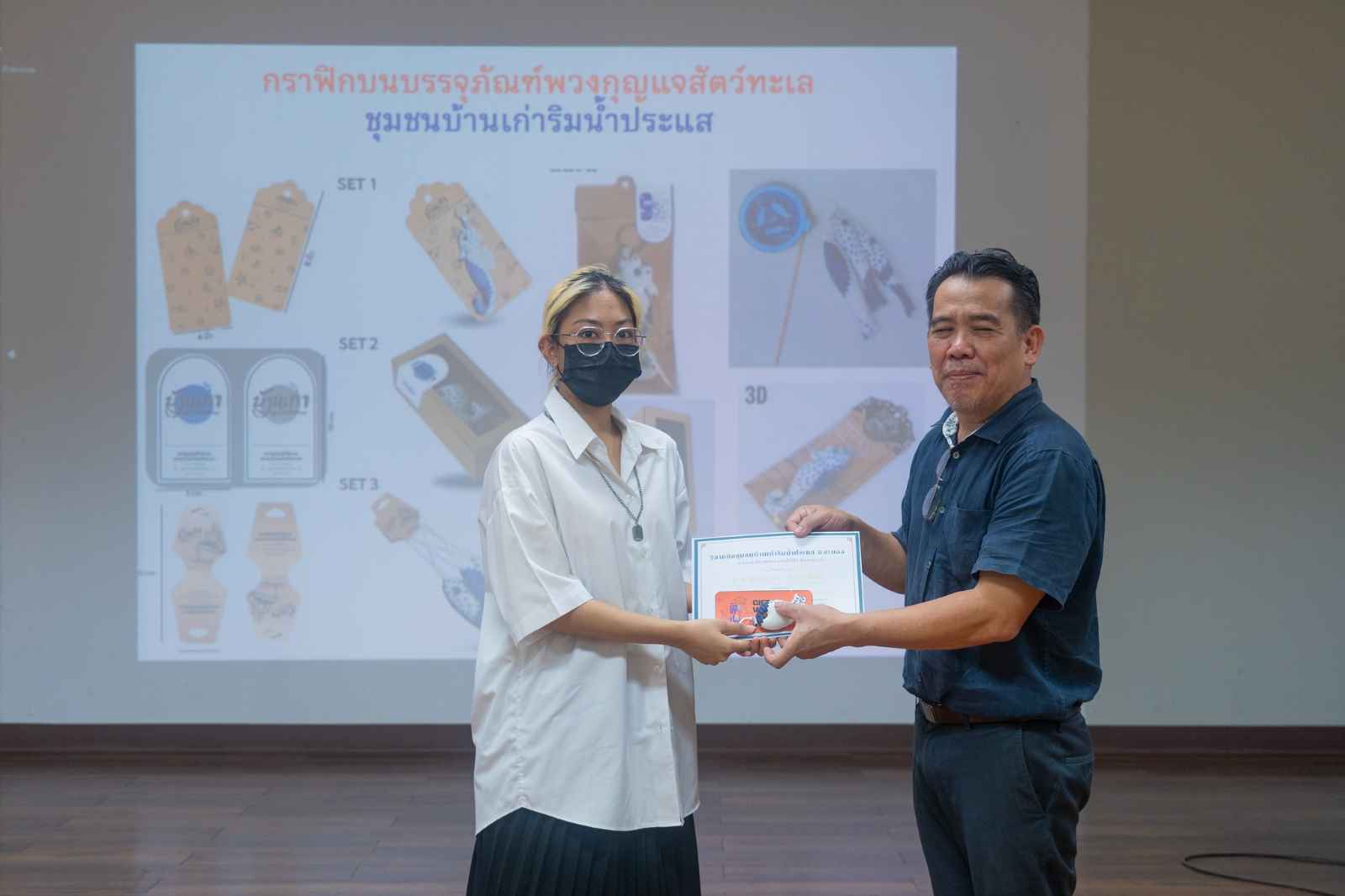 นิสิตสาขาวิชานิเทศศิลป์ ชนะการประกวดในโครงการประกวดออกแบบตราสัญลักษณ์และกราฟิกบนบรรจุภัณฑ์พวงกุญแจสัตว์ทะเล ชุมชนบ้านเก่าริมน้ำประแส จ.ระยอง