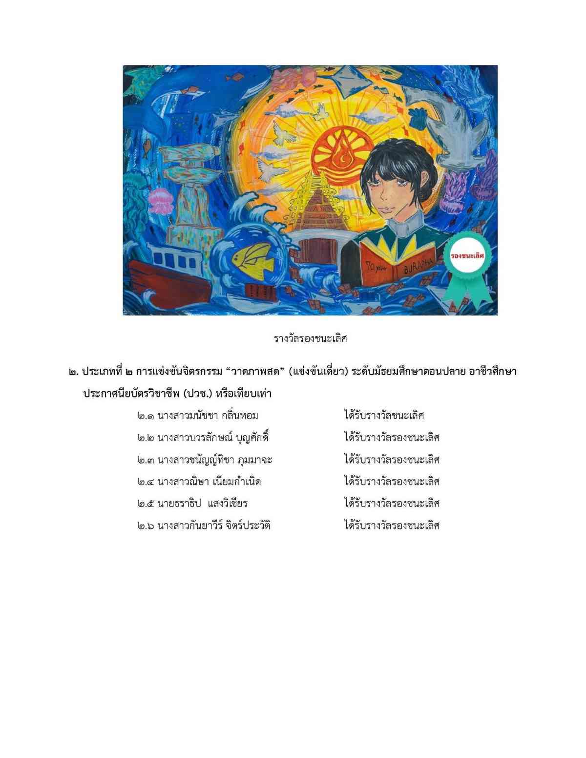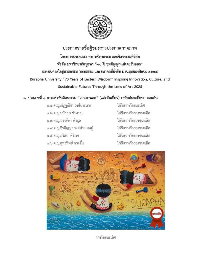 ประกาศรายชื่อผู้ชนะการประกวดวาดภาพ โครงการประกวดวาดภาพจิตรกรรม และจิตรกรรมดิจิตัล หัวข้อ มหาวิทยาลัยบูรพา “70 ปี ขุมปัญญาแห่งตะวันออก” แรงบันดาลใจสู่นวัตกรรม วัฒนธรรม และอนาคตที่ยั่งยืน ผ่านมุมมองศิลปะ 2568