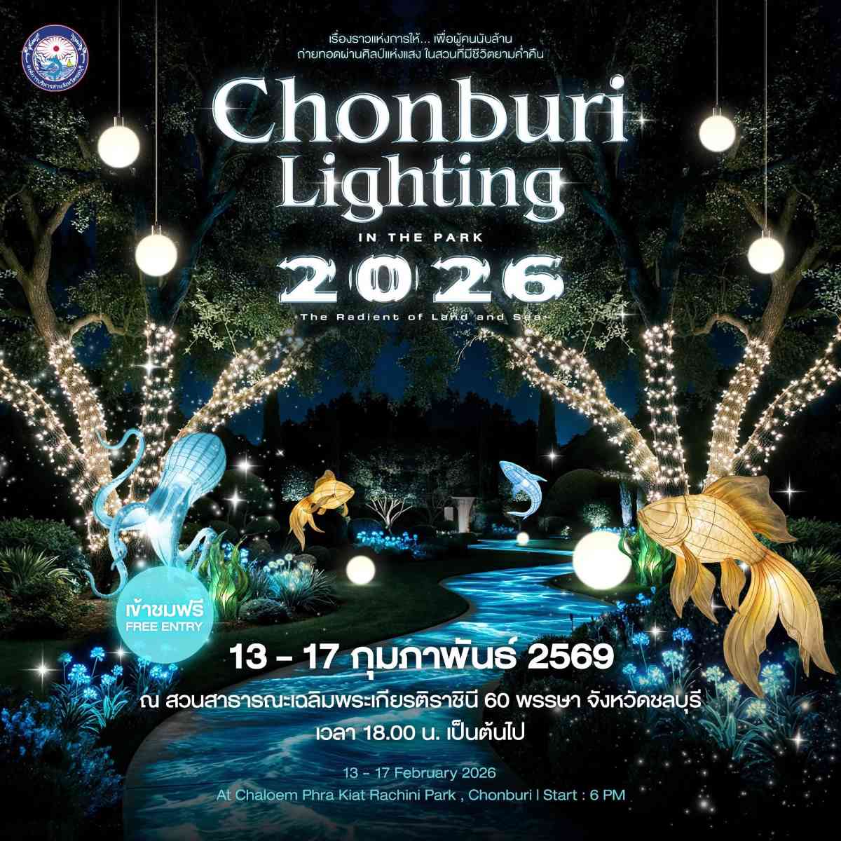 องค์การบริหารจังหวัดชลบุรี ได้จัดโครงการ Chonburi Lighting In The Park 2026 : The Radiant of Land and Sea (งานแสดงศิลปะแสงไฟในสวนยามค่ำคืน….เพื่อร่วมน้อมรำลึกพระบรมราชชนนีพันปีหลวง) เมื่อวันที่ 13 – 17 กุมภาพันธ์ 2569 ตั้งแต่ เวลา 18.00 – 22.00 น. ณ สวนสาธารณะเฉลิมพระเกียรติราชินี 60 พรรษา จ.ชลบุรี ที่ผ่านมา