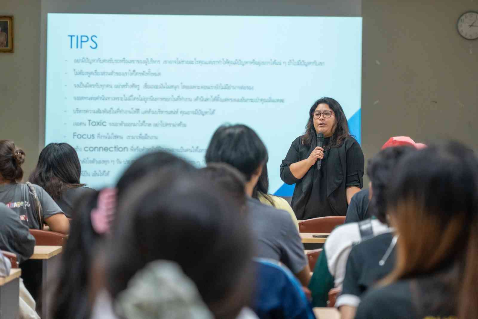 โอกาสนี้ได้รับเกียรติจาก คุณศิริประภา พ่วงศรี ตำแหน่ง HR Section Head จาก Cardinal Health 222 (Thailand) Ltd. ร่วมถ่ายทอดประสบการณ์ตรงจากภาคอุตสาหกรรม พร้อมแนะนำแนวทางสำคัญ อาทิ การปรับตัวในองค์กร ทักษะการสื่อสารและการทำงานร่วมกับผู้อื่น มารยาทและวัฒนธรรมการทำงาน รวมถึงการเตรียมความพร้อมก่อนเริ่มงานจริง
