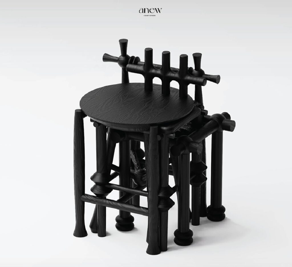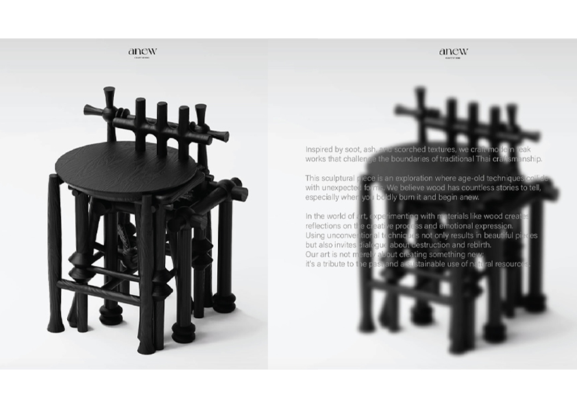 VIPASSA จากการตีความแนวคิด “วิปัสสนา” สู่เฟอร์นิเจอร์ร่วมสมัยที่ส่งผ่านความนิ่ง สงบ และสติ ผ่านรูปทรงเรียบง่ายแต่มั่นคง ผลิตจากไม้สักธรรมชาติที่ผ่านการเผาผิวด้วยเทคนิค Shou Sugi Ban เพื่อสร้างพื้นผิวสัมผัสที่ลึกซึ้งและมีเรื่องราว เป็นชิ้นงานที่ผสมผสานคุณค่าทางวัฒนธรรมและคุณค่าทางศิลปะ