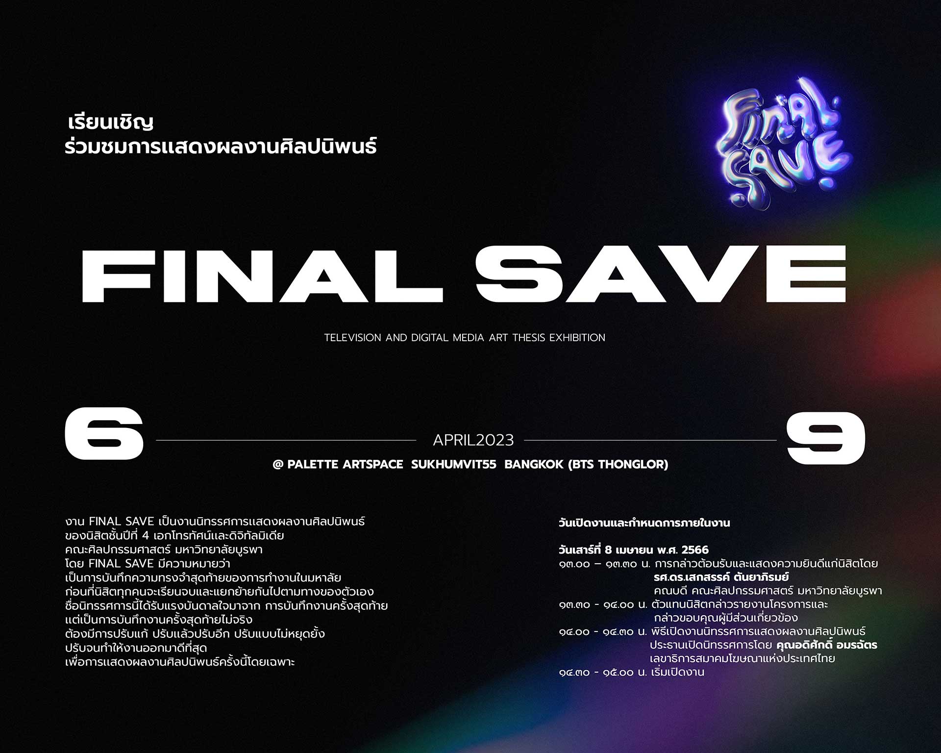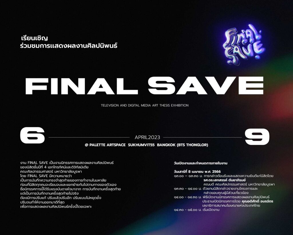 ขอเชิญร่วมให้กำลังใจและชมผลงานศิลปนิพนธ์ ของนิสิตคณะศิลปกรรมศาสตร์ มหาวิทยาลัยบูรพา สาขานิเทศศิลป์ เอกโทรทัศน์และดิจิทัลมีเดีย ในนิทรรศการ “FINAL SAVE” ณ Palette Artspace (ทองหล่อ) ระหว่างวันที่ 6-9 เมษายน 2566