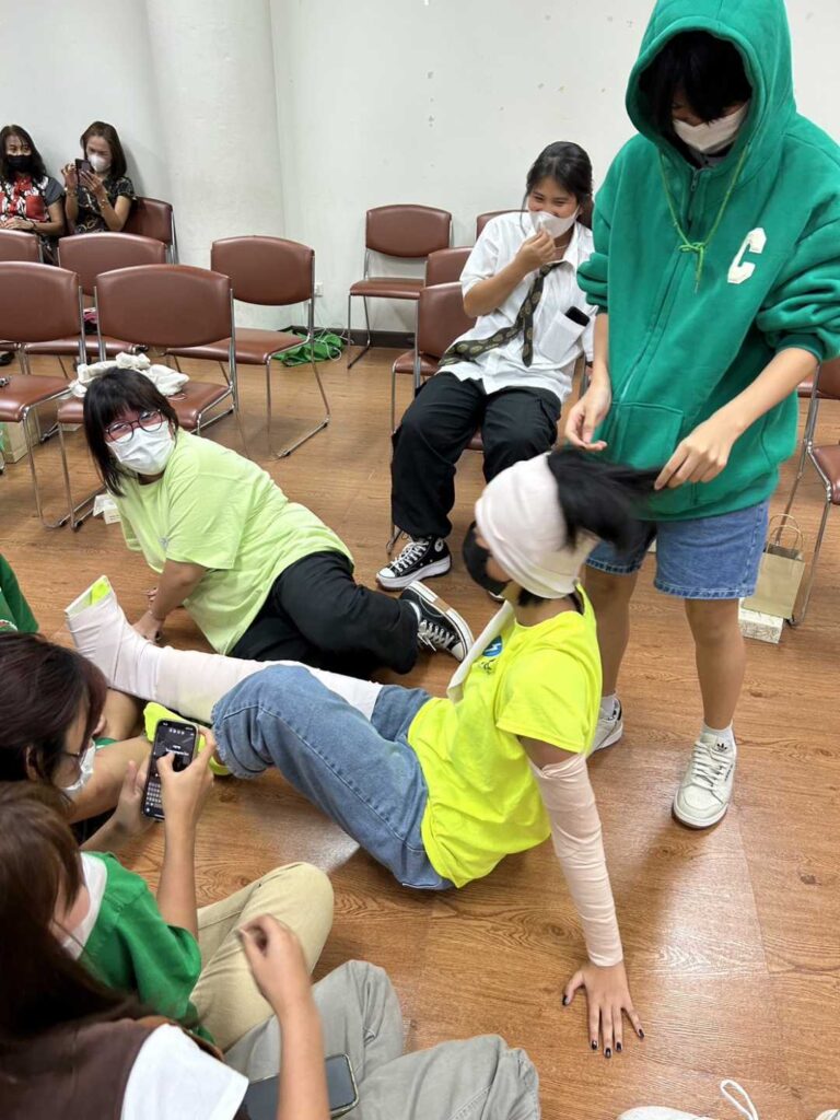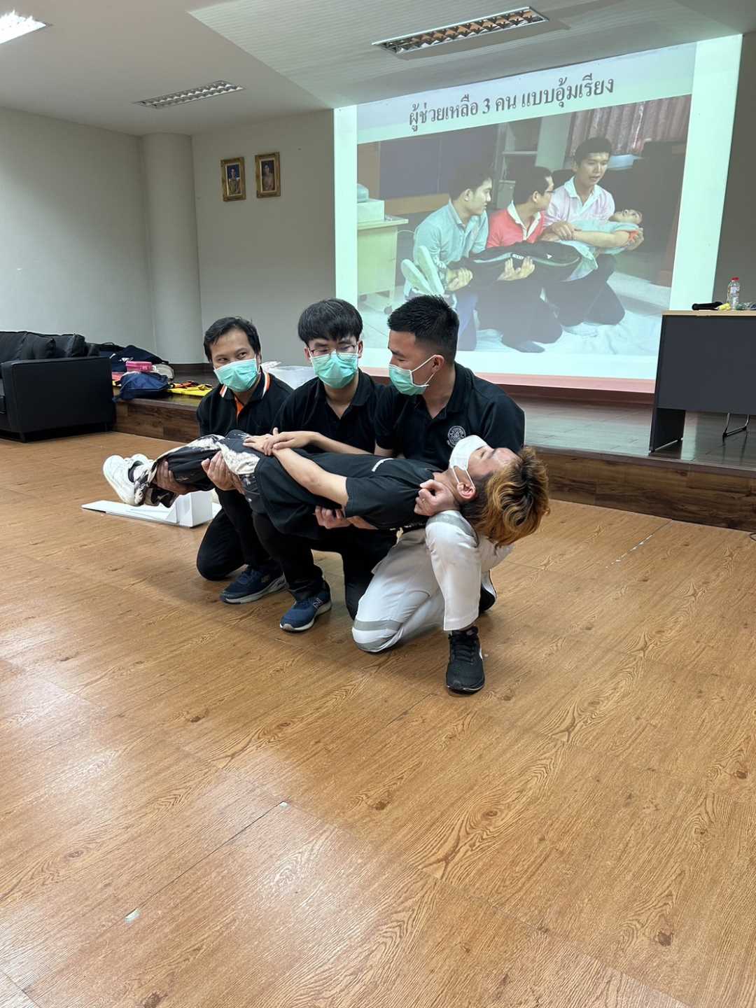 นอกจากนี้ในช่วงบ่ายยังมีกิจกรรมฝึกปฏิบัติเรื่องการปฐมพยาบาลเบื้องต้น การยึดตรึงอวัยวะที่สงสัยการแตก หัก เคลื่อน การเคลื่อนย้ายผู้ป่วยโดยการใช้อุปกรณ์และไม่ใช้อุปกรณ์ และการช่วยฟื้นคืนชีพขั้นพื้นฐานอีกด้วย