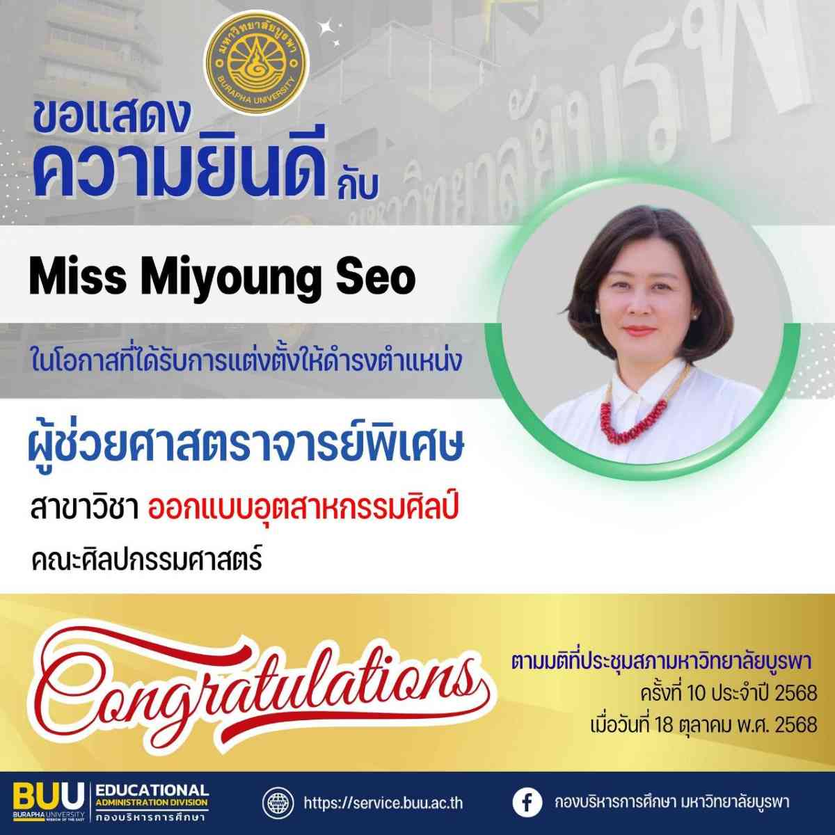 คณะศิลปกรรมศาสตร์ มหาวิทยาลัยบูรพา ขอแสดงความยินดียิ่งกับ ดร.มิยอง ซอ อาจารย์ประจำสาขาวิชาออกแบบผลิตภัณฑ์ ที่ได้รับการแต่งตั้งให้ดำรงตำแหน่งทางวิชาการ “ผู้ช่วยศาสตราจารย์พิเศษ”