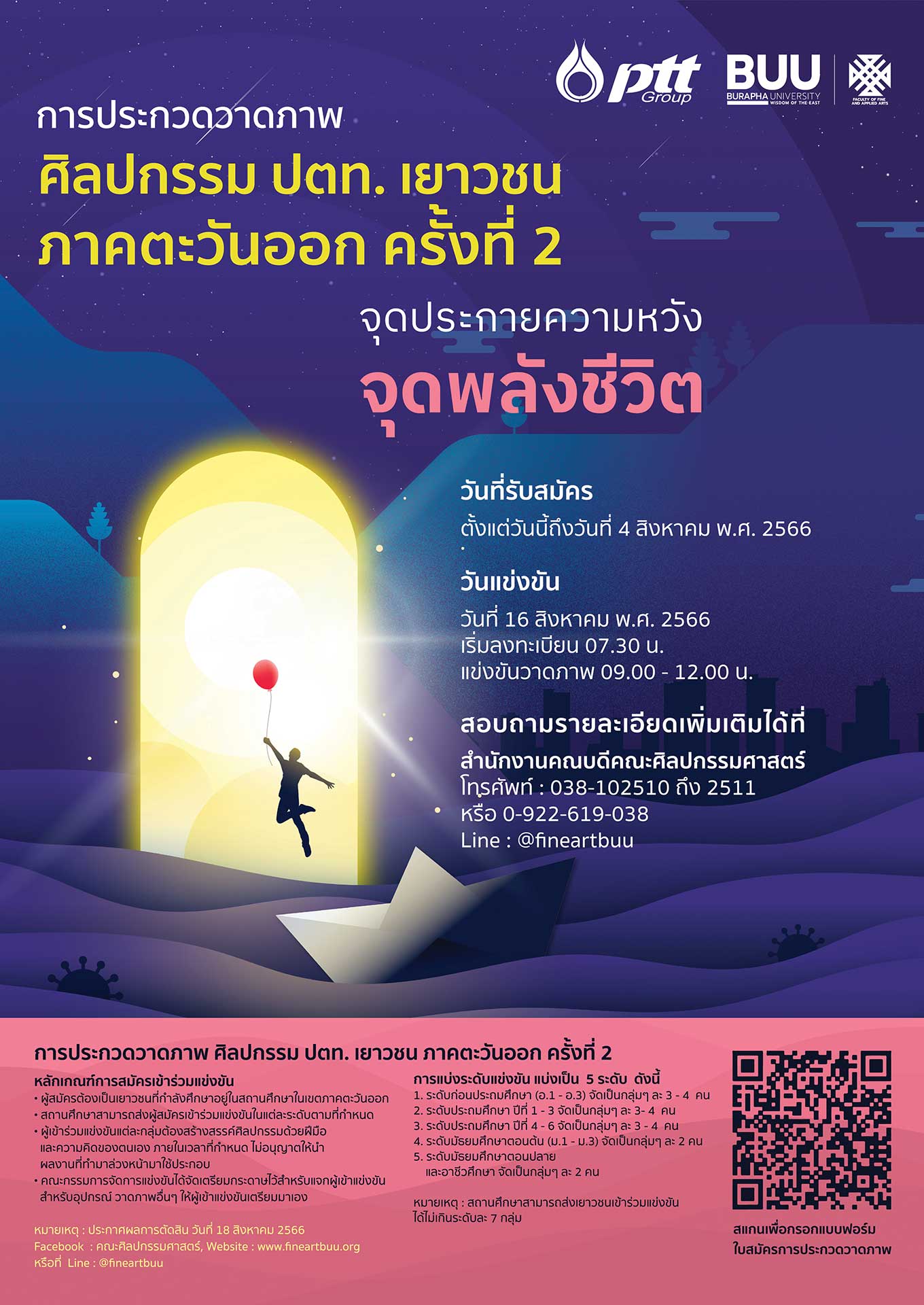 คณะศิลปกรรมศาสตร์ มหาวิทยาลัยบูรพา ร่วมกับ บริษัท ปตท. จำกัด (มหาชน) จัดโครงการประกวดวาดภาพศิลปกรรม ปตท. เยาวชนภาคตะวันออก ครั้งที่ 2 ประจำปี 2566 ในหัวข้อ “จุดประกายความหวัง จุดพลังชีวิต” เพื่อเปิดโอกาสให้ศิลปิน เยาวชน ได้ร่วมถ่ายทอดเล่าความรู้สึกนึกคิด ประสบการณ์ที่ผ่านมาพร้อมความหวังในการขับเคลื่อนไปสู่อนาคตในรูปแบบของงานศิลปะโดยจะมีการแข่งขันประกวดวาดภาพ ในวันพุธที่ 16 สิงหาคม พ.ศ. 2566 ณ อาคารคณะศิลปกรรมศาสตร์ มหาวิทยาลัยบูรพา