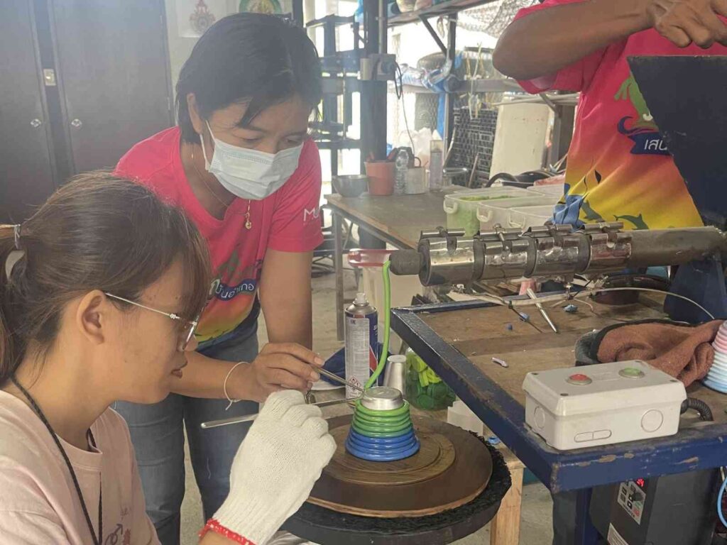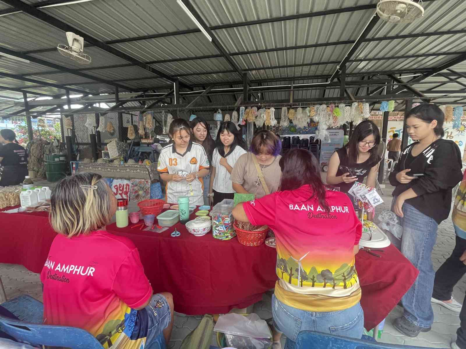 - ฐานที่ 3 การสร้างสรรค์จากถุงพลาสติกเหลือใช้ ตัดพวงมโหตรและสานกระเป๋า เพิ่มมูลค่าเชิงหัตถกรรม