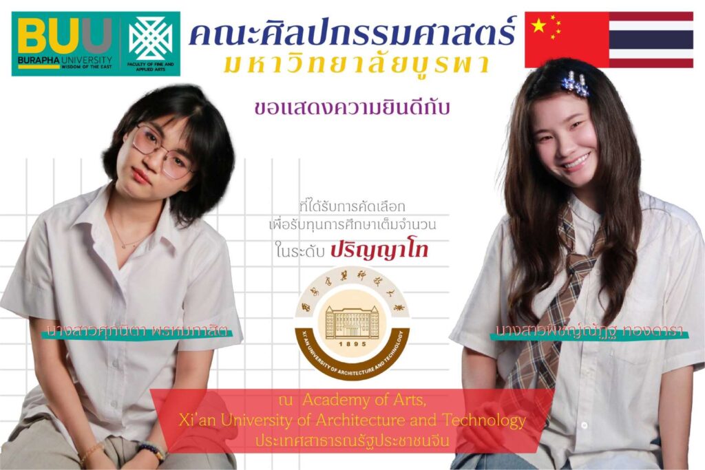 คณะศิลปกรรมศาสตร์ มหาวิทยาลัยบูรพา ขอแสดงความยินดีกับ นางสาวพิชญ์ณัฏฐ ทองดารา และ นางสาวศุภนิตา พรหมภาสิต ในโอกาสที่ทั้งสอง ได้รับการคัดเลือกให้รับทุนการศึกษาเต็มจำนวนในระดับปริญญาโท ณ Academy of Arts, Xi’an University of Architecture and Technology ประเทศสาธารณรัฐประชาชนจีน